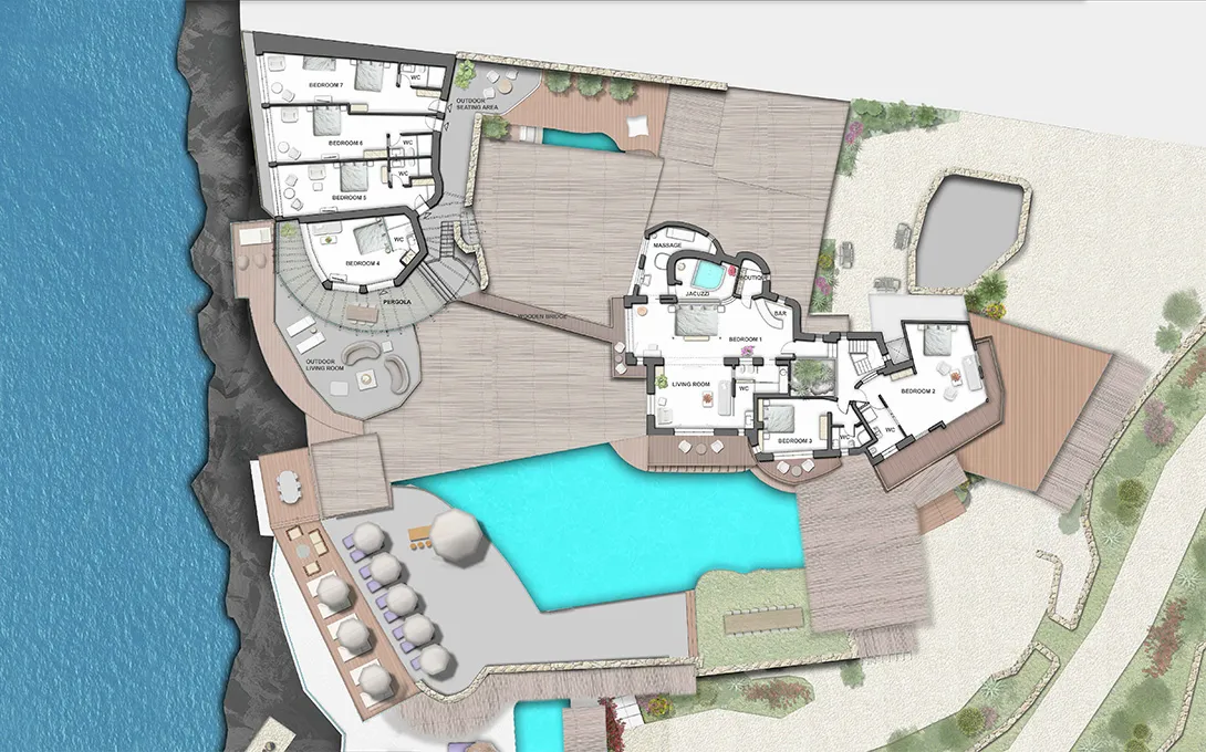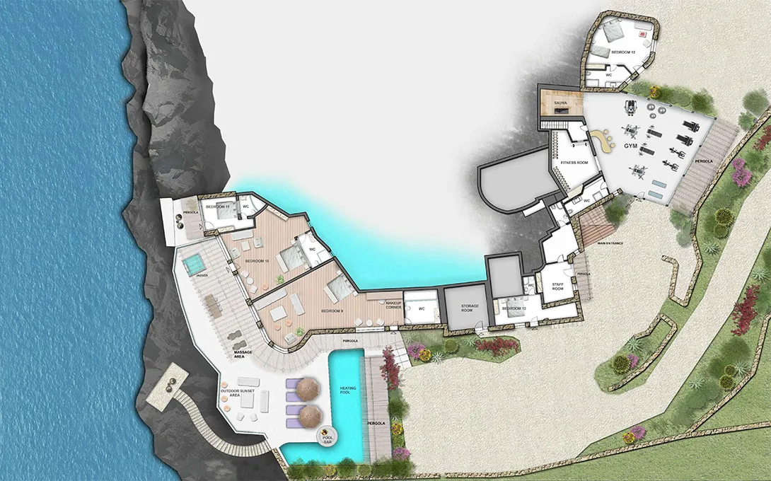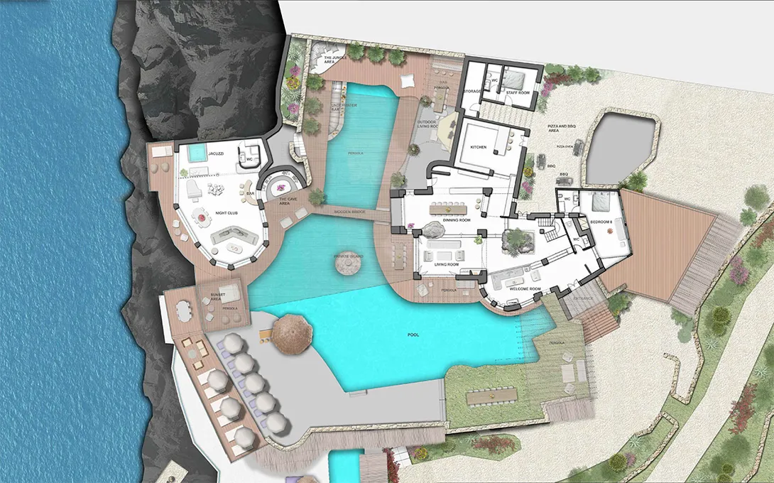 Totally isolated, this 4 level villa features 11 exquisitely appointed bedrooms for prestigious guests, 2 rooms for the staff, 8 cozy bars, 6 private dining areas, 12 cocooning areas with palm trees offering miraculous vistas to the Aegean Sea, a pool of 550m2, swim up bars and private boats waiting to sail you across the azure sea with a glass of champagne.